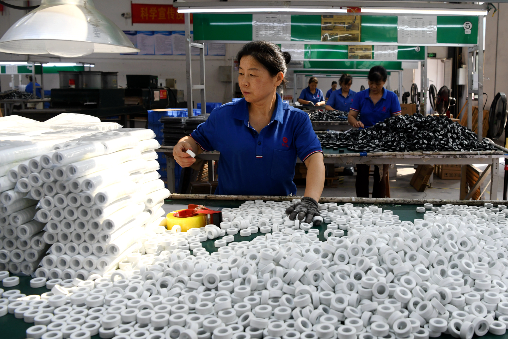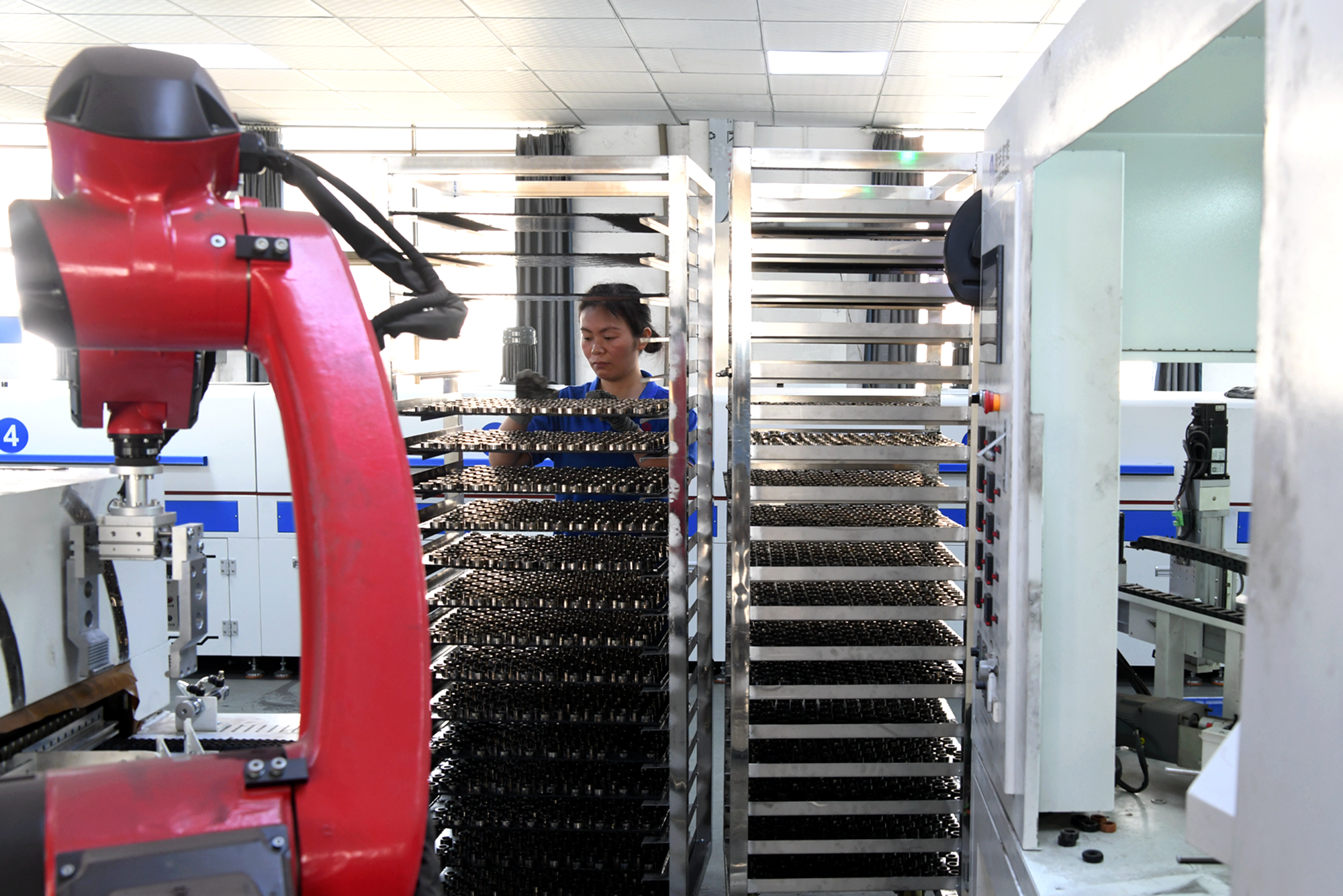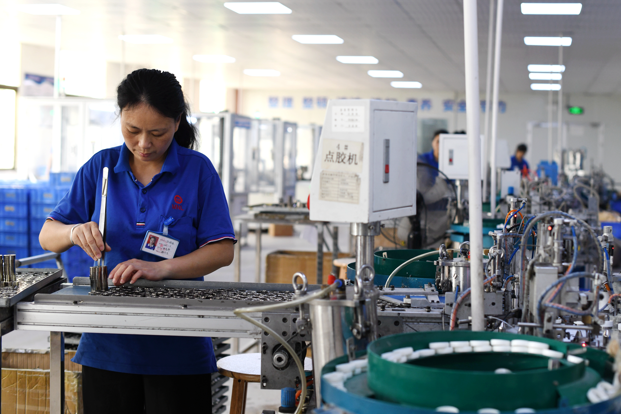 2024年9月11日,在湖北省咸宁市通城经济开发区坪山高新技术产业孵化园,湖北玛耐伦科技有限公司车间内,工人们正在生产、组装磁芯产品,准备发往市场。